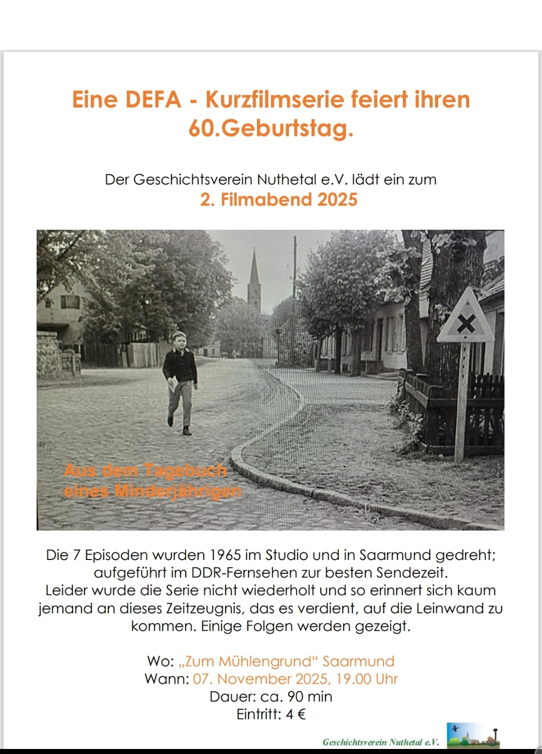 07.11.2025: Wir zeigen zwei bis vier Kurzfilme, die in Saarmund gedreht wurden. 19 Uhr im Mühlengrund Saarmund, Mühlenstraße 6. Eintritt 4 €
